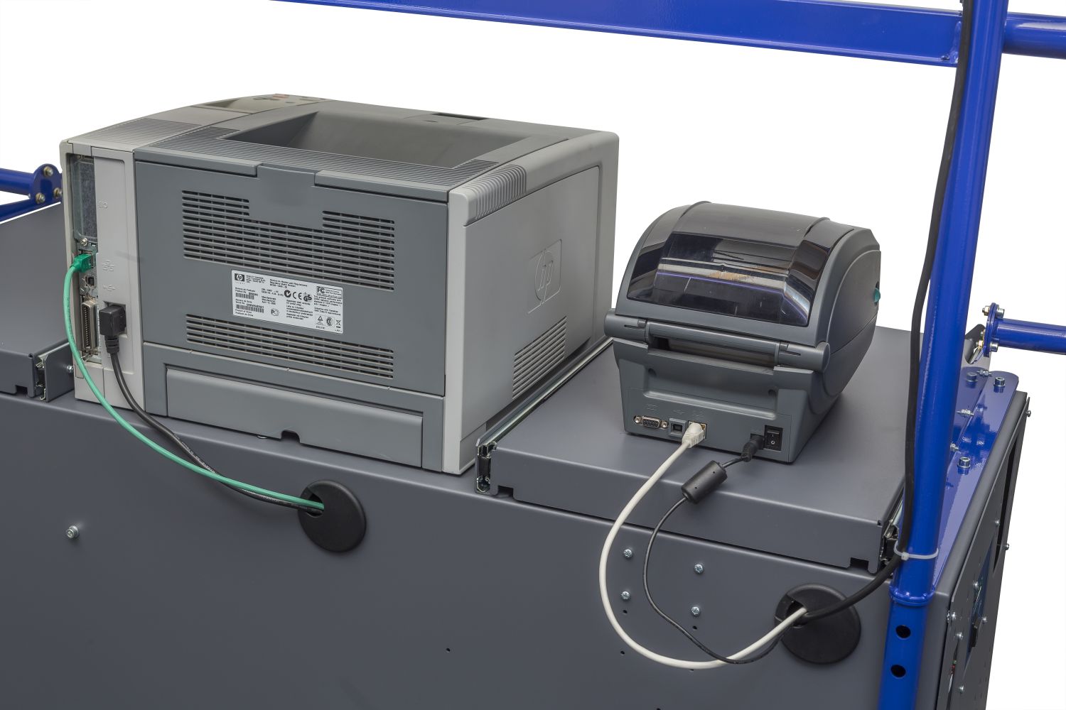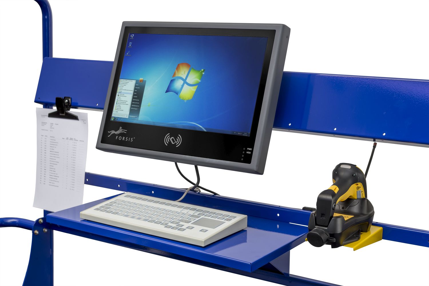 Die 3D-Version bietet die größte vertikale und horizontale Arbeitsfläche dieser Serie. Die Konstruktion aus pulverbeschichtetem Stahlblech (ca. 1800 mm H × 1500 mm B) ermöglicht vielfältige Konfigurationen mit mehreren Druckern, einem PC oder Thin Client, einer Waage und Peripheriegeräten. Die 3D-Workstation eignet sich für Konsolidierung, Qualitätskontrolle und Kommissionierung, wo mehrere Prozesse zusammenlaufen. Die breite Basis verhindert das Stapeln von Komponenten und sorgt für Ordnung bei den Kabeln, wodurch Störungen und Ausfallzeiten vermieden werden. Zur Stromversorgung der Geräte stehen 24-V-Batterien mit 50, 80 oder 100 Ah (≈ 1,2–2,4 kWh) und Wechselrichter mit 350, 650, 800 oder 1200 W zur Verfügung.Die extra große mobile Arbeitsstation mit Akkus dient in erster Linie der Optimierung der Arbeitsprozesse, da ein direkter und schneller mobiler Zugriff auf übergeordnete Systeme gewährleistet wird. Diese Variante der mobilen Arbeitsstation mit Akku ist das größte Modell aller mobilen Arbeitsstationen, da sie Platz für bis zu drei Drucker bietet. Dank verschiedener Lochbilder können Bedieneinheiten und weiteres Zubehör einfach untergebracht werden.