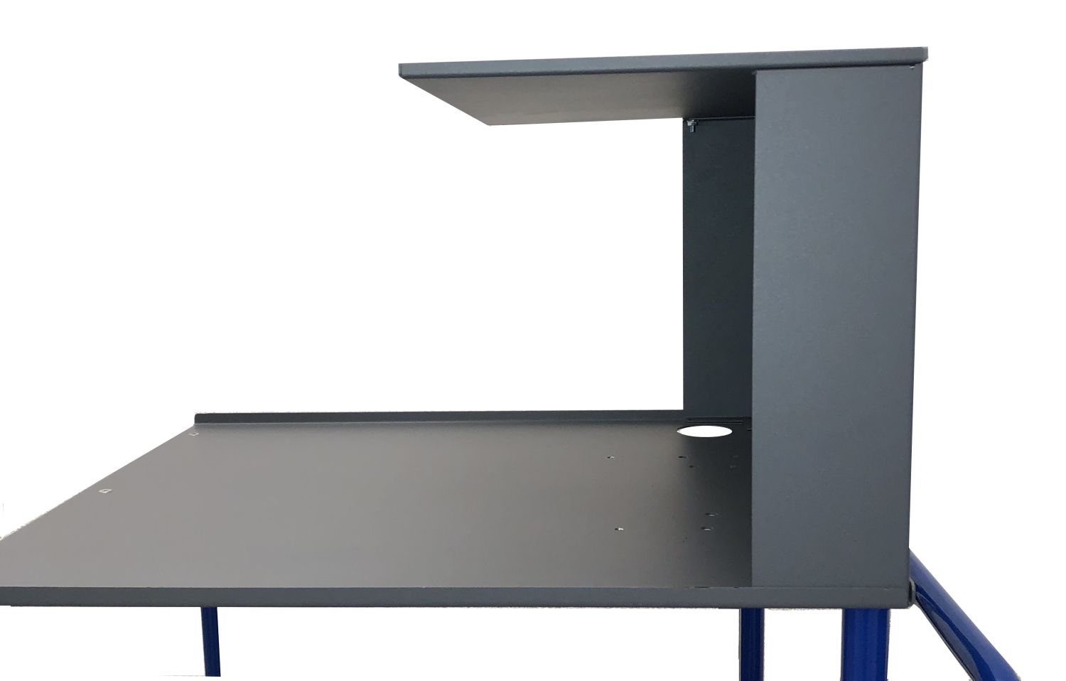 Die „Tischhalterung“ erweitert die Funktionalität des mobilen Büros um eine weitere Ebene. Sie schafft quasi eine dritte Ebene. Neben der Druckerposition unten und der Standardarbeitsfläche in Tischhöhe bieten die Tischhalterungen darüber noch mehr Nutzungsmöglichkeiten.
